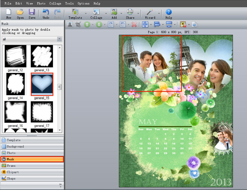 提供不同樣式的圖形,如方形、圓形、星形、心形等等,供使用者作為相片修飾選擇。