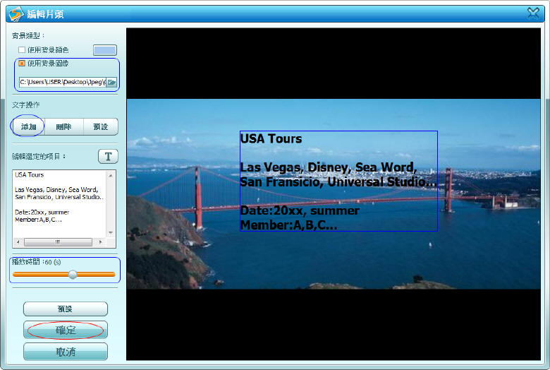 編輯"片頭":選取圖片、添加文字、播放時間。按"確定"。