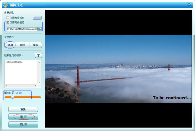編輯"片尾":選取圖片、添加文字、播放時間。按"確定"。