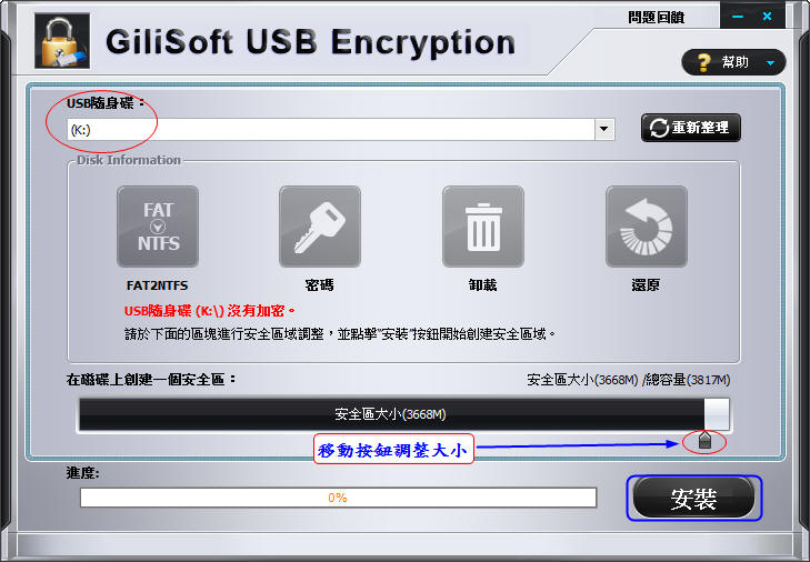 選擇USB裝置的位址並設定”安全區”大小,按”安裝”按鍵