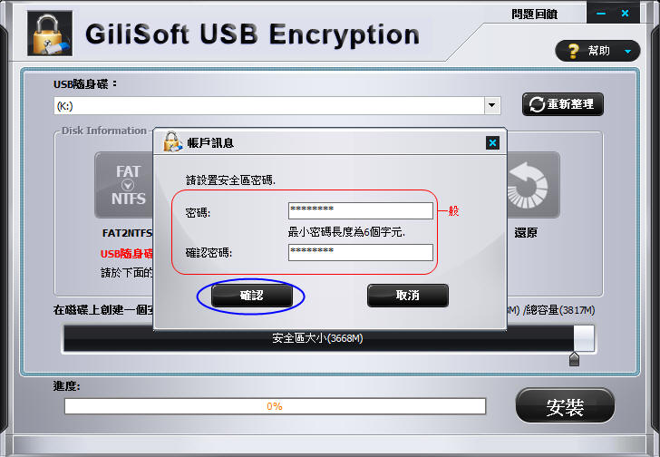 設定”安全區”密碼、確定按鍵,開始創建”安全區”