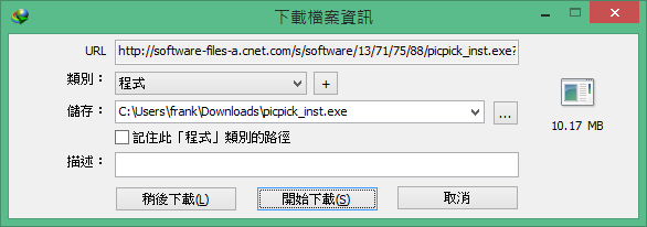 在網頁上按下下載時軟體的顯示畫面。 按下「開始下載」,便可立即下載檔案
