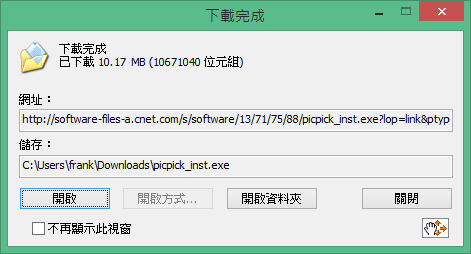 檔案下載完成時的畫面。 下載完成後,可以選「開啟資料夾」來查看及瀏覽所下載的檔案。