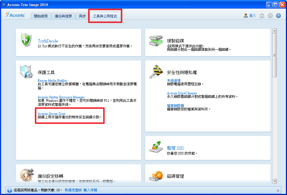 建立 Acronis Secure Zone(簡稱 ASZ,後以安全區簡稱之),主要是在電腦上一個特殊的磁碟分割磁區。我們可以用它來儲存 Acronis True Image 的備份檔。在這個磁區上,我們沒辦法任意修改、新增、刪除檔案,但可以讀取、複製。也因此存放於該磁區上的備份檔是安全的,不會被任意地修改或刪除,這可確保備份檔的正確性,以避免日後資料還原時發生錯誤。 建立安全區是非常簡單的,在軟體主畫面上方點選『工具與公用程式』,再點選『Acronis Secure Zone』。
