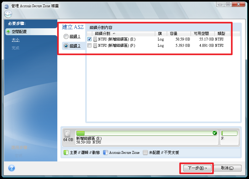 出現『管理 Acronis Secure Zone 精靈』,Acronis 會詢問我們要在哪裡建立安全區。以本例來說,我們在第二顆硬碟中建立安全區,又因為我們原本第二顆硬碟有做了磁碟分割(即 E 槽和 F 槽),所以要調整其中一個分割區的容量,並將閒置的空間做為安全區。因此我們選了 E 槽,原因是它的容量以及可用空間較大。 最後,再按【下一步】。
