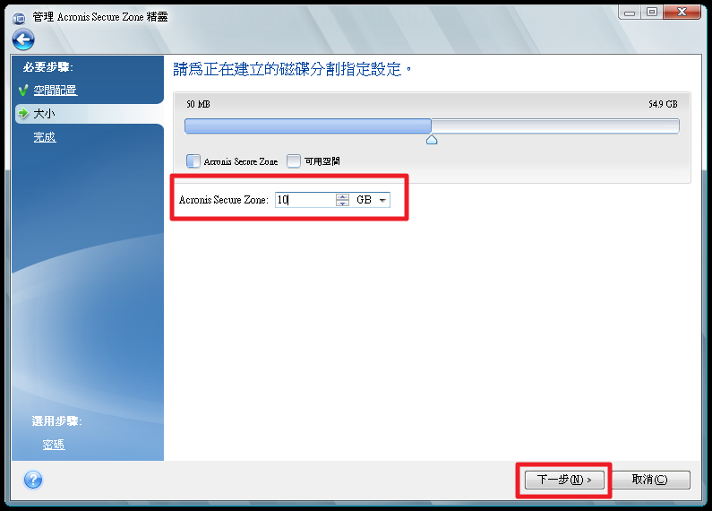 再來就是設定安全區的大小,以本例來說,安全區的空間設定了 10 GB。 最後,再按【下一步】。