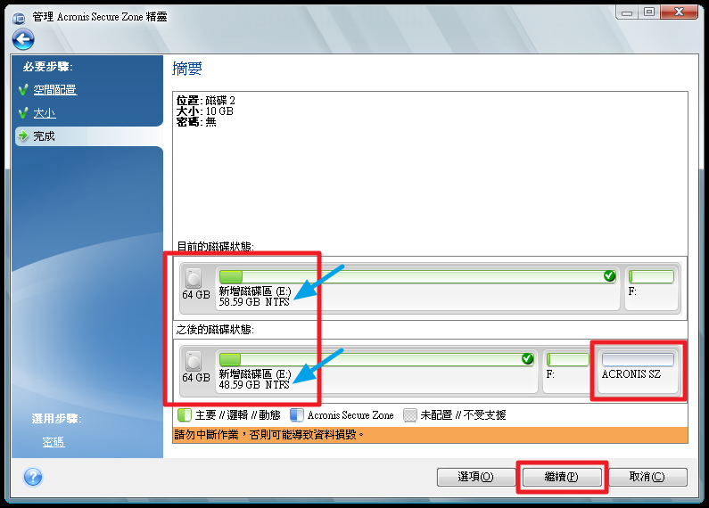 接下來,我們可以從圖中觀察到,安全區建立前與建立後的磁碟分割狀況。 以本例來說: 【分割前】 E 槽原本為 58.59 GB 【分割後】 E 槽減少了 10 GB,變成 48.59 GB,同時多了 ACRONIS SZ,ACRONIS SZ 就是指安全區,它在產生後,會有 10 GB 的空間。 最後,再按【繼續】。
