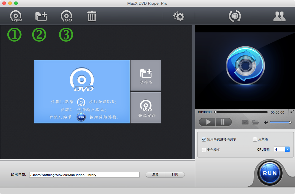 開啟 MacX DVD Ripper Pro 後,最上方三個圖示,分別代表加入不同格式的 DVD 影音光碟。