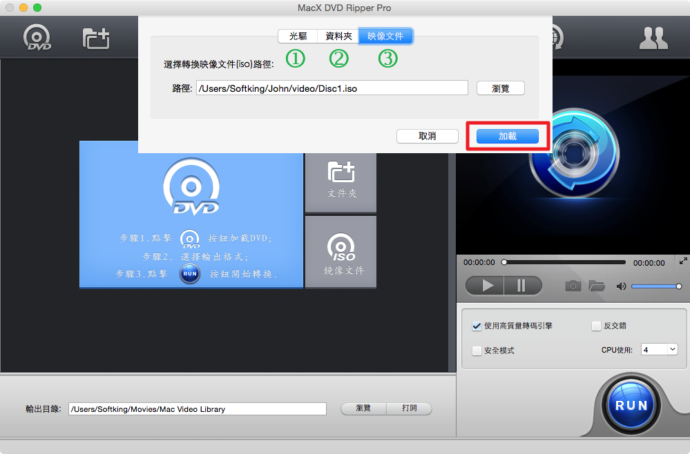 再來就是選擇 DVD 的來源了,圖中的 1 ~ 3,與上圖及其說明,都是相對應的,這也是稍早會說無論點選哪個圖示,都可以在接下來的步驟再進行切換之故。 為了加速,電腦上已經有一個 DVD 影音光碟的 ISO 檔,所以我們直接選取完後,再按【加載】。