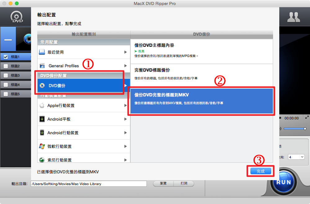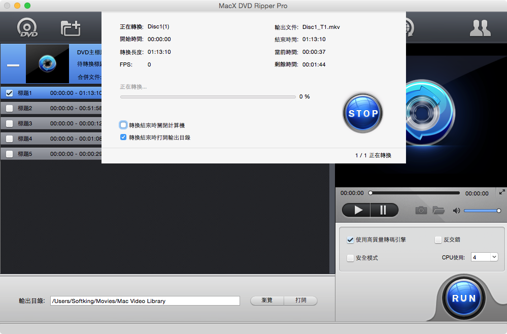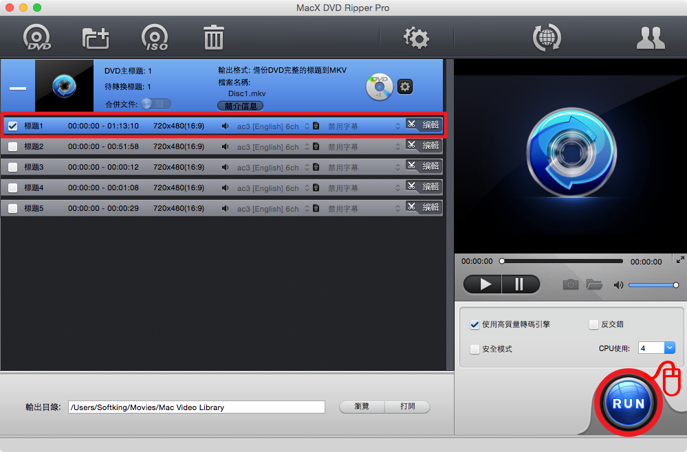 預設情況,MacX DVD Ripper Pro 只會幫我們選取 DVD 的主影片部份,通常我們觀看 DVD 都是主影片,它的時間也是最長的。 從圖中會發現,主影片出現了「禁用字幕」,理論上,出現禁用字幕的字眼,輸出的影片都不會包含字幕,但因為我們是選擇完整備份,所以不會受到影響,事實上那部份是根本無法選擇的,預設就是完整備份,因此不用擔心輸出的影片沒有字幕。 如果沒有再做什麼設定調整,我們只要按下右下的【RUN】就會進入轉檔程序了。