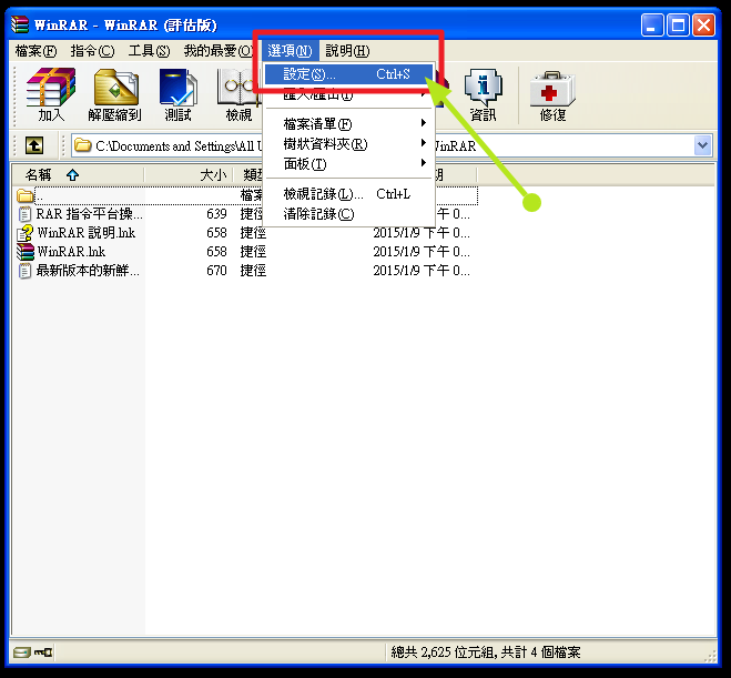 預設的情況之下,WinRAR 不會幫我們的 RAR 壓縮檔加入修復記錄。為了日後方便時用,建議先將修復記錄開啟,並將它設為壓縮檔的預設值。這可避免日後每次建立壓縮檔案都要手動啟用修復記錄。 首先,開啟 WinRAR 的主視窗,先點選上方的『選項』,再點「設定」。 如果找不到 WinRAR 的主視窗,可以在任一 RAR 的壓縮檔連按兩下,也會看到 WinRAR 的主視窗。
