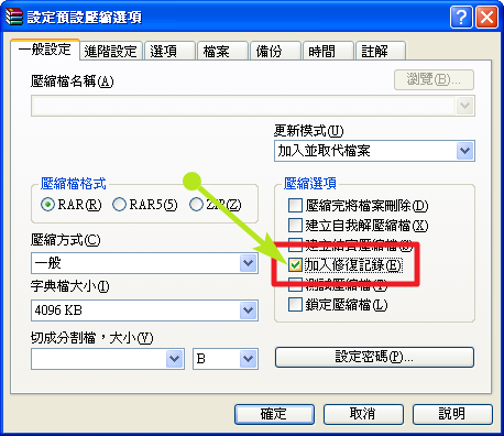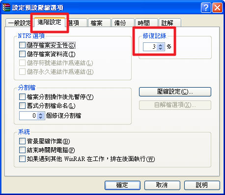 再切換到『進階設定』,在修復記錄這裡,預設會加入 3% 的修復記錄,一般來說,修復記錄的合理設定是 3~10%。但要注意,加入愈多的修復記錄,壓縮檔的檔案大小,也會變得更大。 最後,再按兩次【確定】按鈕,就又會回到 WinRAR 的主視窗了。