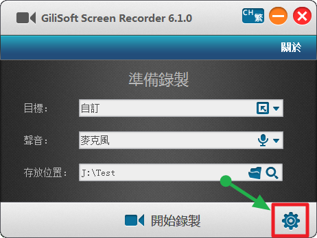 首先,先開啟 GiliSoft Screen Recorder,並按下軟體主畫面右下的【齒輪】圖示。