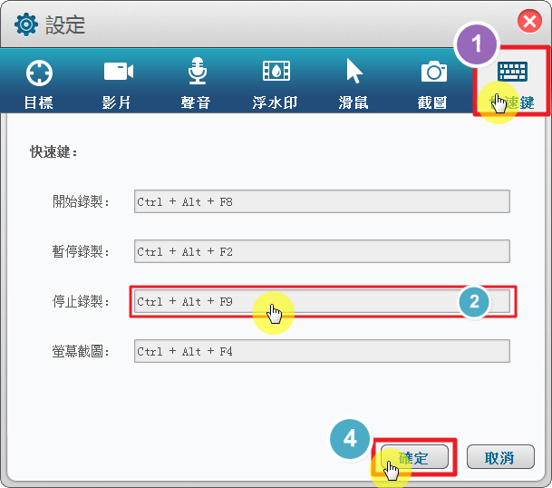 想要修改,就先在停止錄止後的方框中先點一下,按住 Ctrl 和 Alt,再按一下F9,此時會發現方框中文字已變為 Ctrl + Alt + F9 那就代表設定成功,最後再用滑鼠按一下【確定】即可。3