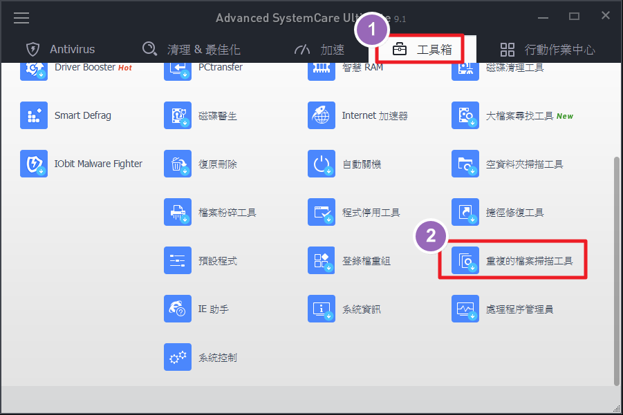 找出重複檔案,減少無謂的硬碟空間浪費,提昇檔案管理的效率。(IObit Advanced SystemCare Ultimate)