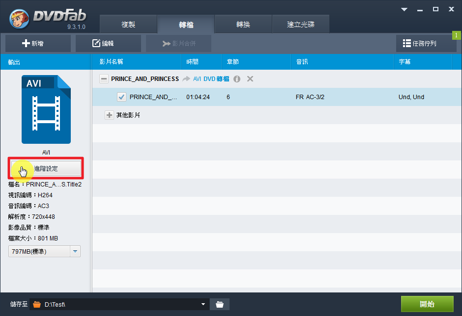 開啟 DVDFab 後,若光碟機中已置入 DVD 或著藍光光碟,DVDFab 會自動分析並讀取影片,再按左邊的【進階設定】。