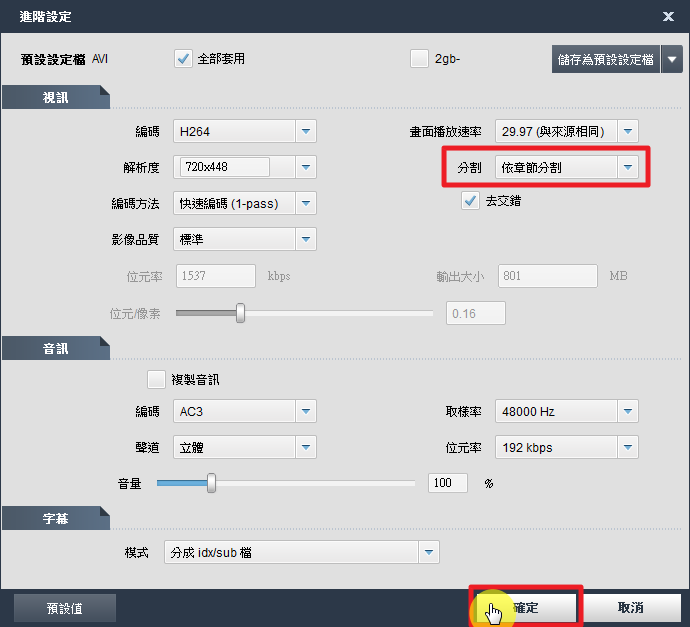 再將『分割』由原本的「不分割」選擇為「依章節分割」,再按下【確定】。 ※ 這種方式適合我們需要全部的章節時使用。