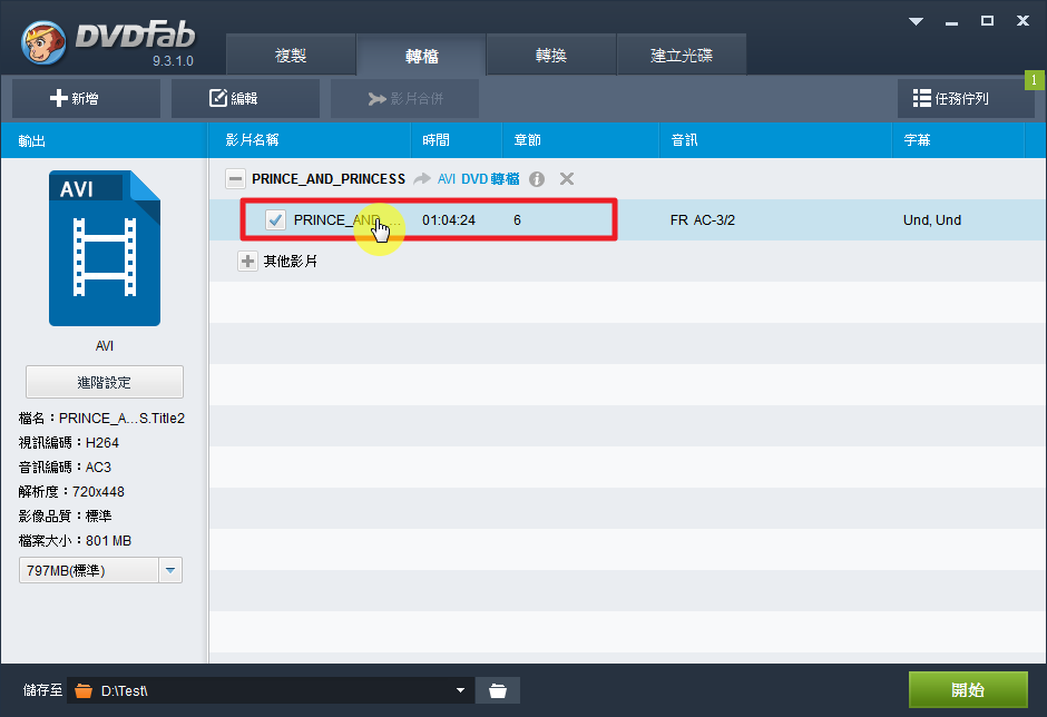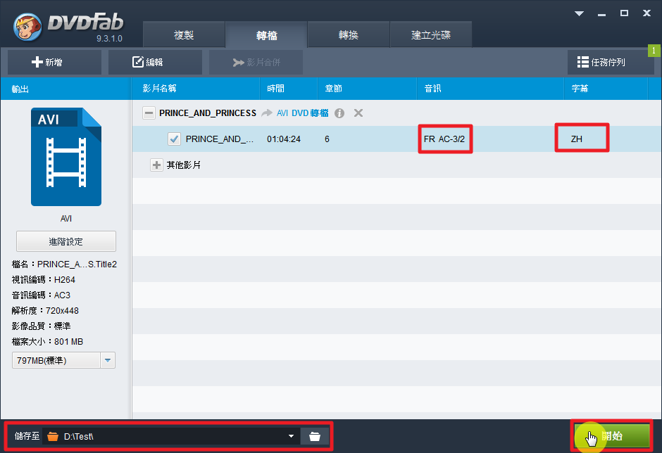 最後會回到 DVDFab 的主畫面,你可以調整要使用的語言、字幕以及轉檔後儲存的位置。 最後再按下右下的【開始】進入轉檔程序即可。